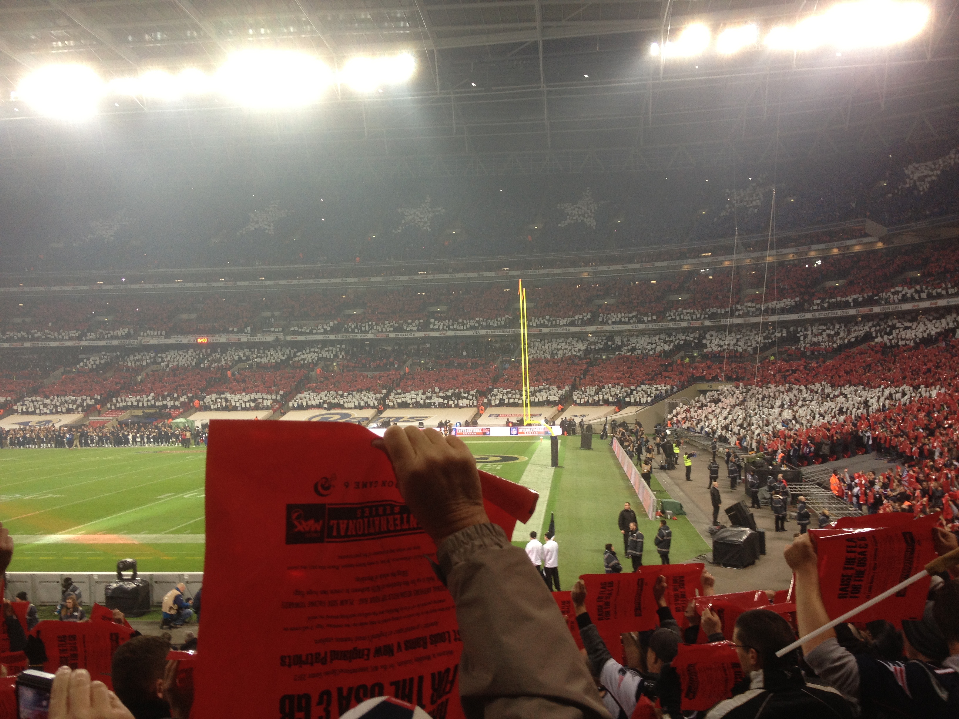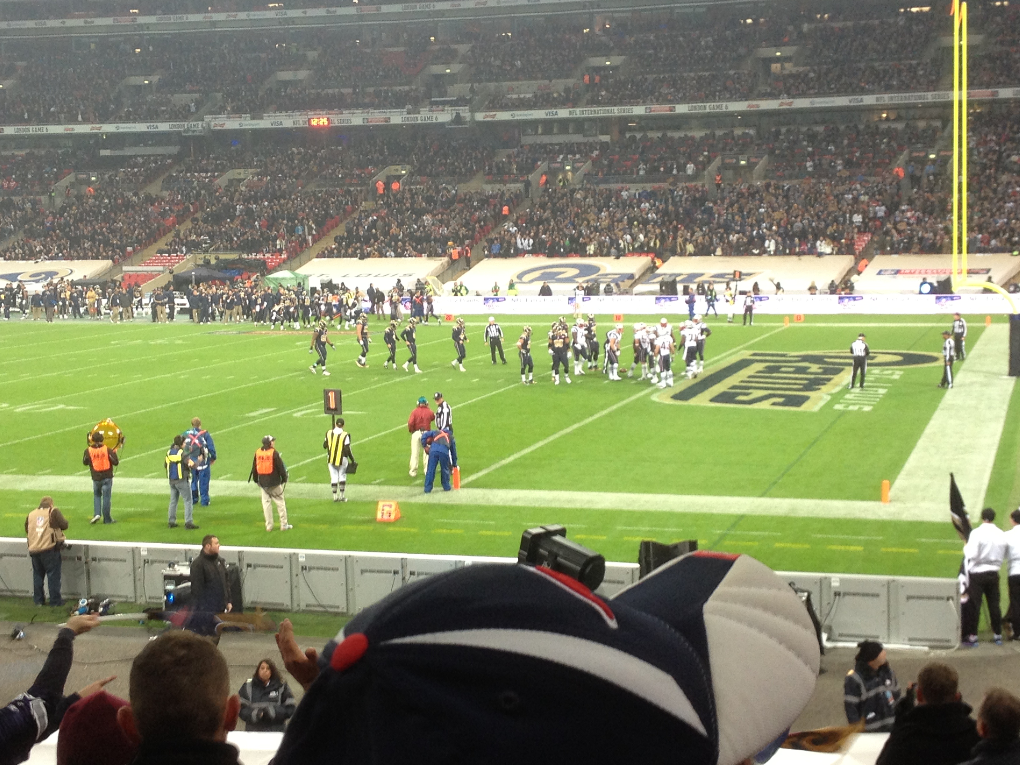 J’aperçois vaguement Robert Kraft le propriétaire de l’équipe de la Nouvelle-Angleterre qui salue quelques officiels dont le maire de Londres (très applaudi lors de sa brève allocution) puis les joueurs regagnent leurs bancs de touche respectifs tandis que l’équipe spéciale des Rams (qui a choisi à la pile ou face de commencer le match en attaque) se met en position pour recevoir. Gostkowski, le kicker des Patriots prend son élan et frappe…